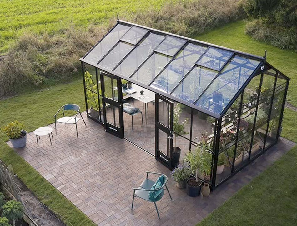 Langhlið hússins er mun hærri en í sambærilegum gróðurhúsum, sem skapar aukna lofthæð og rúmgóða upplifun. Það er búið tvískiptri, tvöfaldri hurð með opnanlegu fagi og styrkt svörtum stálplötum í gaflinum. Húsið er fáanlegt í tveimur stærðum: